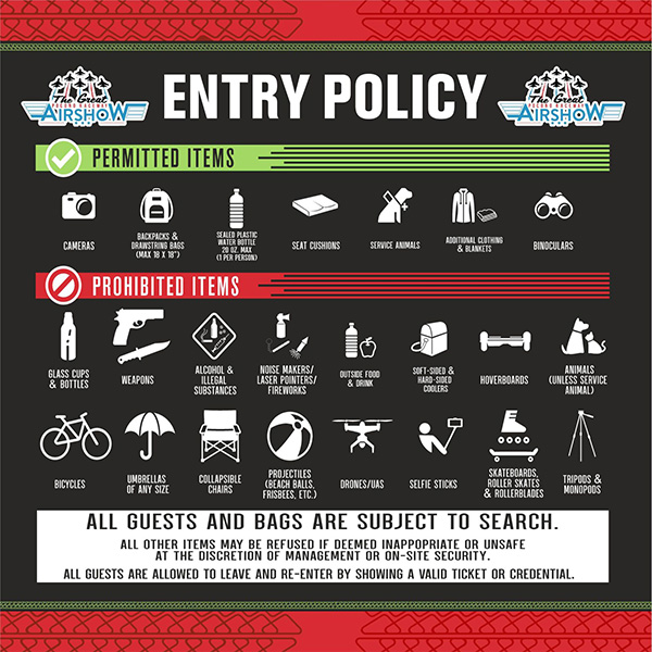 Coolers and outside food or beverages will NOT be permitted through the gates. Except for one (1) sealed plastic water bottle per guest. (20oz max size)